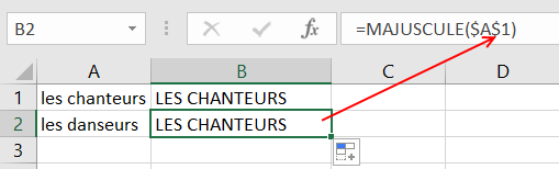 On remarque que la référence $A$1 est la même dans la cellule B2 et B1. Dans les deux cas la formule « =MAJUSCULE($A$1) » utilise la référence “$A$1“