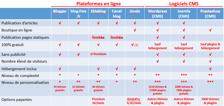 (1) la personnalisation de Jimdo nécessite souvent l’offre payante Jimdopro